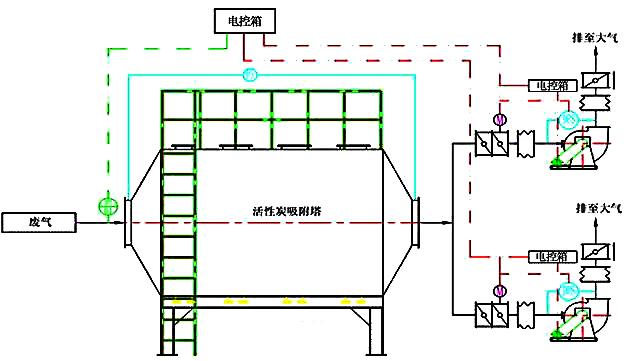 活性炭吸附設(shè)備主要由活性炭吸附器(孔板、活性炭吸附層) 、離心風(fēng)機、電控箱、風(fēng)道、排氣筒等部件組成。